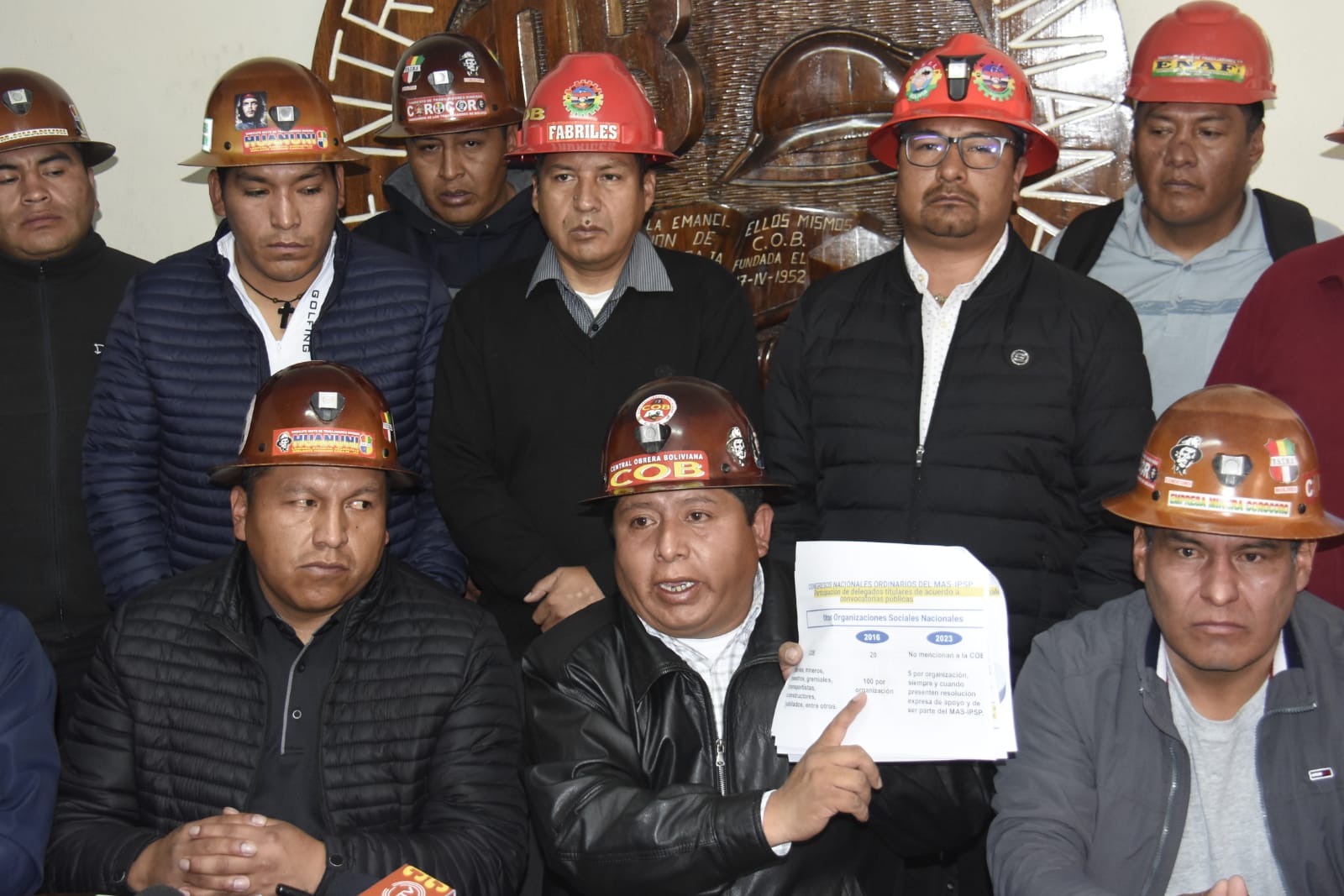 Rodeado de dirigentes sindicales, ejecutivos regionales y departamentales, el secretario ejecutivo de la COB, Juan Carlos Huarachi, hizo pública la determinación asumida por el sector de los trabajadores, que se suma a similares decisiones asumidas por organizaciones sociales y fundadoras del instrumento político MAS-IPSP.