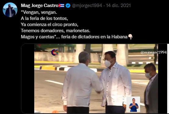 En otro tuit, acompañado de la fotografía de Arce y el presidente cubano Miguel Díaz-Canel dándose un apretón de manos, escribió: “Vengan, vengan. A la feria de los tontos. Ya comienza el circo pronto. Tenemos domadores, marionetas, magos y caretas…feria de dictadores en La Habana”.