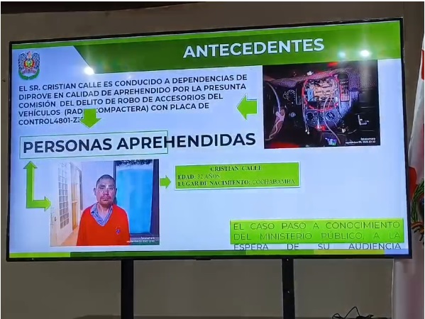 El director de DIPROVE, Coronel Erwin Montaño, informó sobre el caso ocurrido el día anterior, indicando que a las 21:00 horas se presentó una denuncia por el «robo de accesorios. En sí, el equipo de sonido de un vehículo». El Coronel Montaño señaló que, tras el despliegue de tareas investigativas y de inteligencia, «se logra aprehender al autor y se lo pone en calidad de aprehendido al conocimiento del Ministerio Público a la espera de la audiencia de medidas cautelares».