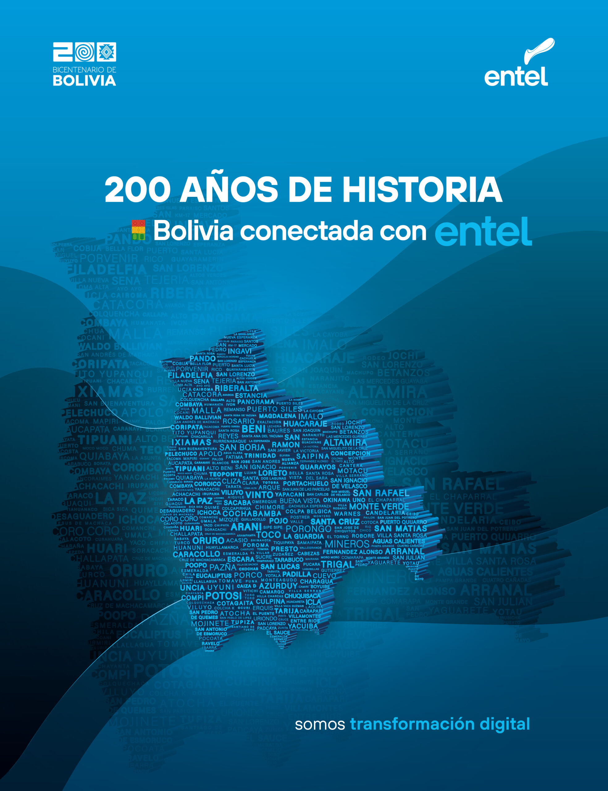 En el año del Bicentenario, ENTEL S.A. se erige como el pilar estratégico que impulsa a Bolivia hacia una nueva era digital. Con su despliegue de redes, servicios e infraestructura tecnológica, la empresa conecta al país con el futuro, integrando a cada boliviana y boliviano a una conectividad moderna, inclusiva y soberana.