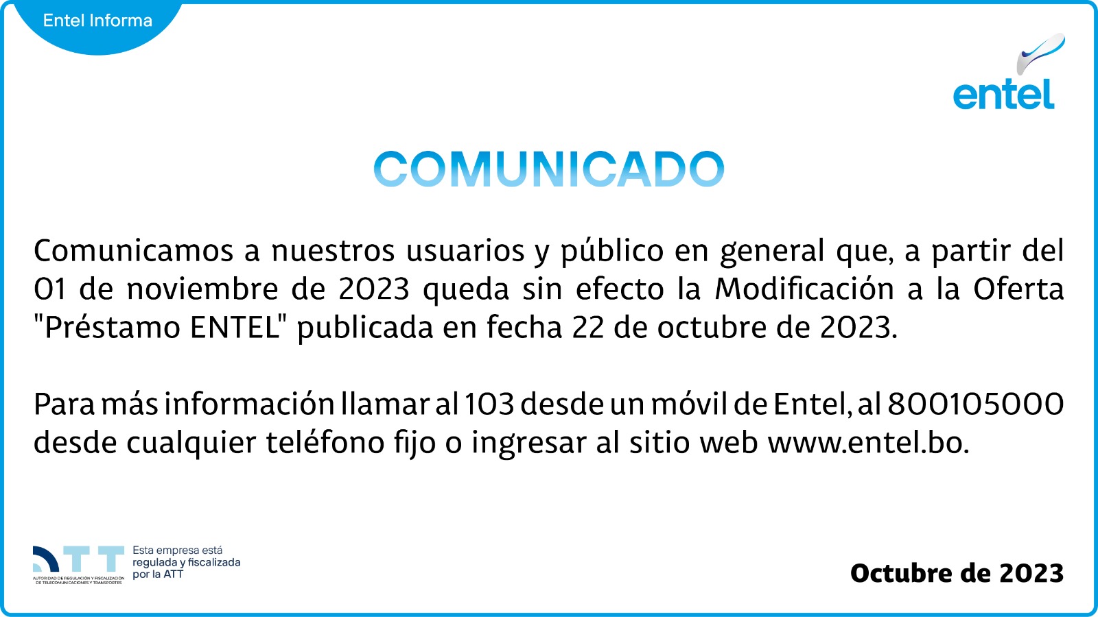 La Empresa Nacional de Telecomunicaciones (Entel S.A.) deja sin efecto la modificación a la oferta “Préstamo ENTEL”, que se lanzó el pasado 22 de octubre, a través de la cual, se tenía un costo establecido según el monto prestado.