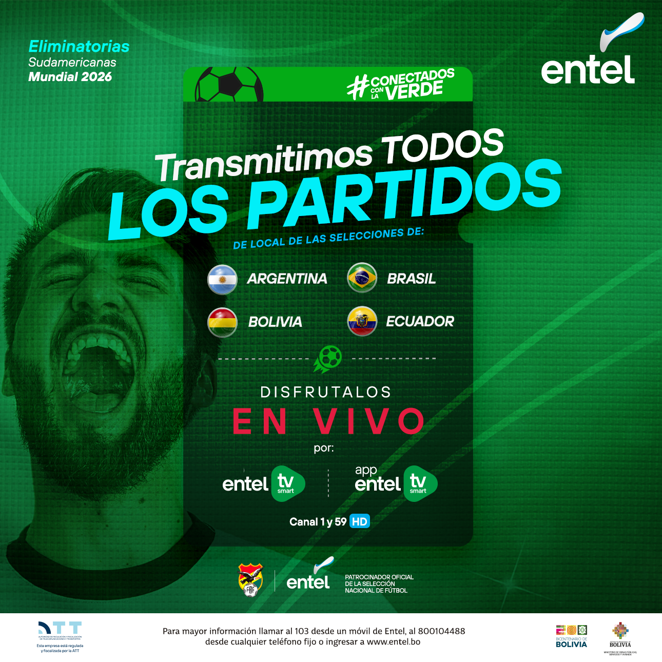 ¡Vuelve la pasión de multitudes! La Empresa Nacional de Telecomunicaciones (ENTEL S.A.) transmitirá los 36 partidos de fútbol que jugarán los seleccionados de Argentina, Brasil, Bolivia y Ecuador de local en el marco de las eliminatorias sudamericanas con miras al Mundial México/Estados Unidos/Canadá 2026.