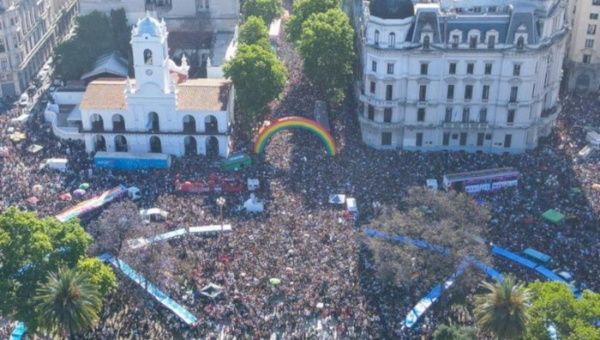 La movilización comenzó en la Plaza de Mayo, frente a la sede del Ejecutivo argentino, y a través de un arco iris de colores apostado al inicio de la Avenida de Mayo se traslada a la Plaza de los dos Congresos, frente al Parlamento.