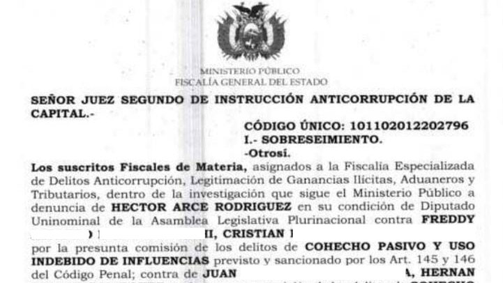 El diputado Arce informó a ERBOL que la Fiscalía determinó el sobreseimiento de todos los implicados, a pesar de que presentó pruebas contundentes sobre corrupción.