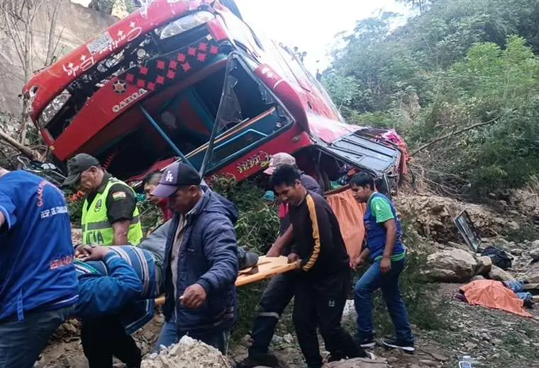 Embarrancado por aproximadamente 20 metros, así terminó un bus de la empresa de transporte ‘Villa Imperial’, por inmediaciones de los Valles cruceños, preliminarmente se informó que hay aproximadamente 40 pasajeros heridos y cinco fallecidos.