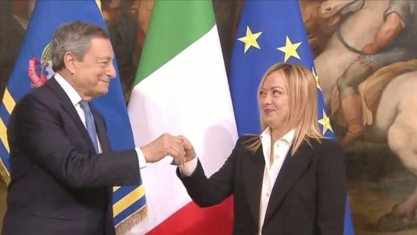 El dimitido Mario Draghi pasó el «relevo» a la nueva primera ministra, lideresa del partido ultraderechista Hermanos de Italia, que ganó las elecciones parlamentarias del 25 de septiembre.