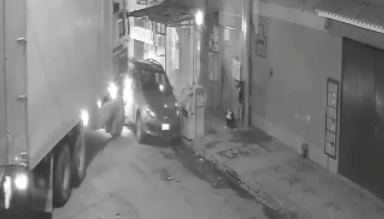 Un hecho de tránsito fue captado por cámaras de seguridad, protagonizado por un camión de alto tonelaje en la calle Acre, que impactó a un automóvil estacionado.