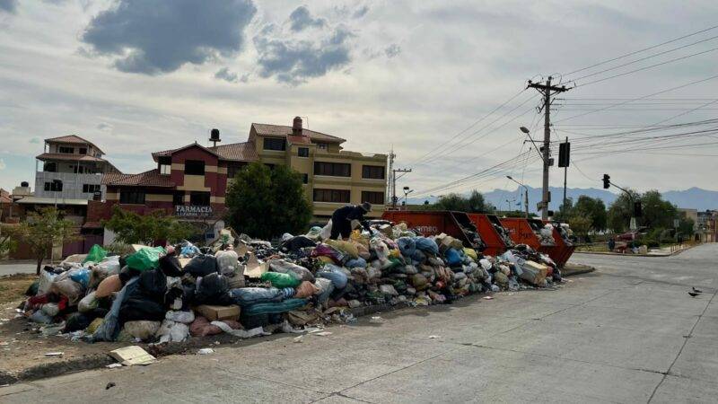 A cinco días del bloqueo en el botadero de K’ara K’ara por vecinos del Distrito 15, la basura se acumula en las calles de la ciudad de Cochabamba, donde se genera unas 600 toneladas (t) al día, por lo que se estima que más de 2.400 t de residuos sólidos no ingresaron al basurero, a eso se suma las 2 t de residuos hospitalarios.