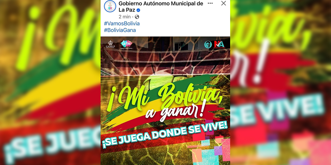 El Gobierno Autónomo Municipal de La Paz (GAMLP) publicó en sus redes sociales una imagen que buscó darle apoyo a la Selección boliviana, sin embargo, esta mostró la bandera nacional con los colores invertidos.