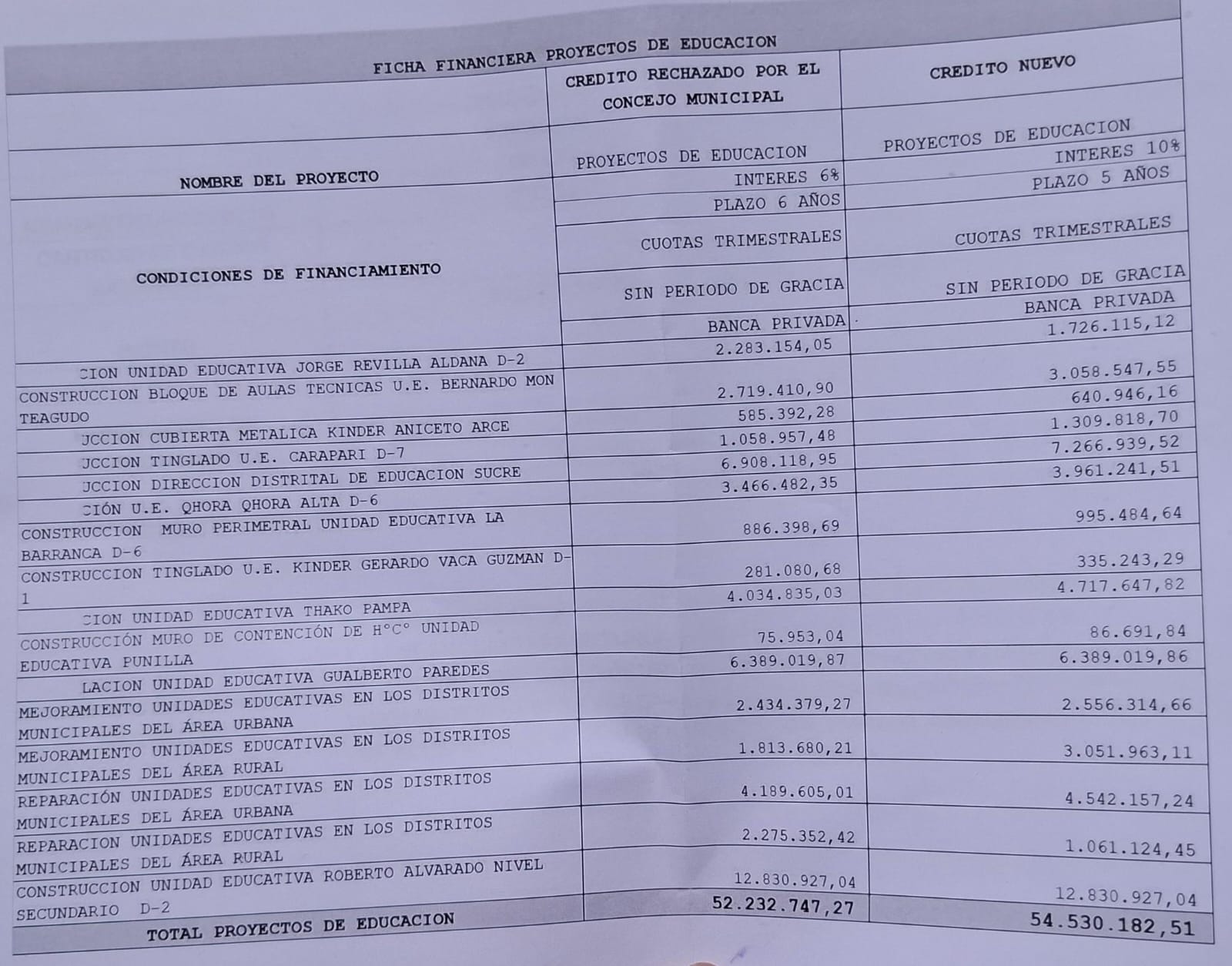 El proyecto original, que ascendía a Bs 52.232.747,27, fue rechazado por el Concejo, lo que, según Calvimontes, significa que si no hubiese existido tal decisión, la Dirección «actualmente ya tendríamos los cursos vigentes, ya estaríamos iniciando con lo que son las primeras etapas de licitación».