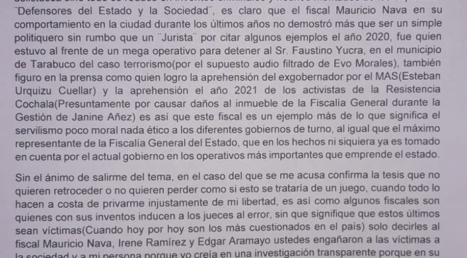 En relación con el fiscal Mauricio Nava Morales, crítico su comportamiento en años anteriores, calificándolo como un «simple politiquero sin rumbo». Se mencionan operativos en los que estuvo involucrado, resaltando que Nava Morales fue el responsable de detener a Faustino Yucra y aprehender al exgobernador Esteban Urquizu Cuellar.