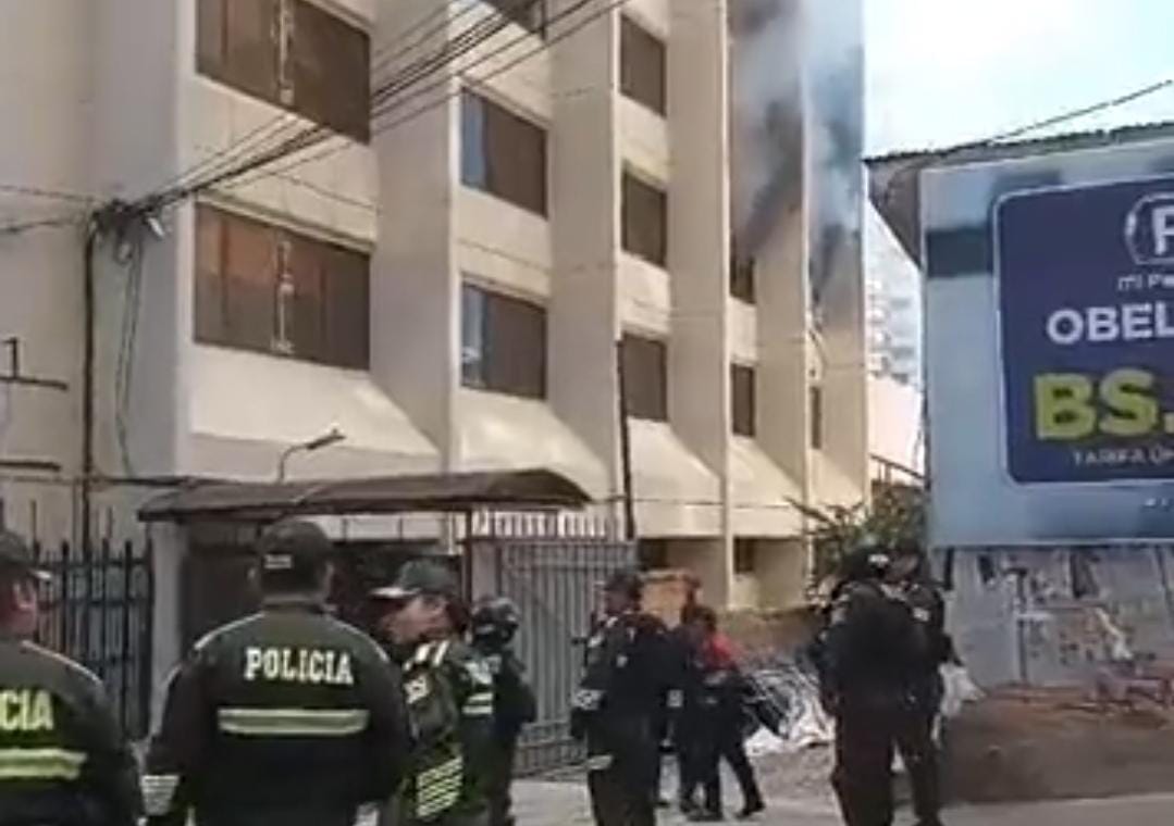 “La Unidad de Bomberos ha acudido al llamado de auxilio en la avenida Mariscal de Santa Cruz. Estamos en pleno proceso de sofocar el incendio (…). Había personas que estaban trabajando, hay una persona que por el humo ha tenido alguna afectación”, dijo en contacto con la prensa.