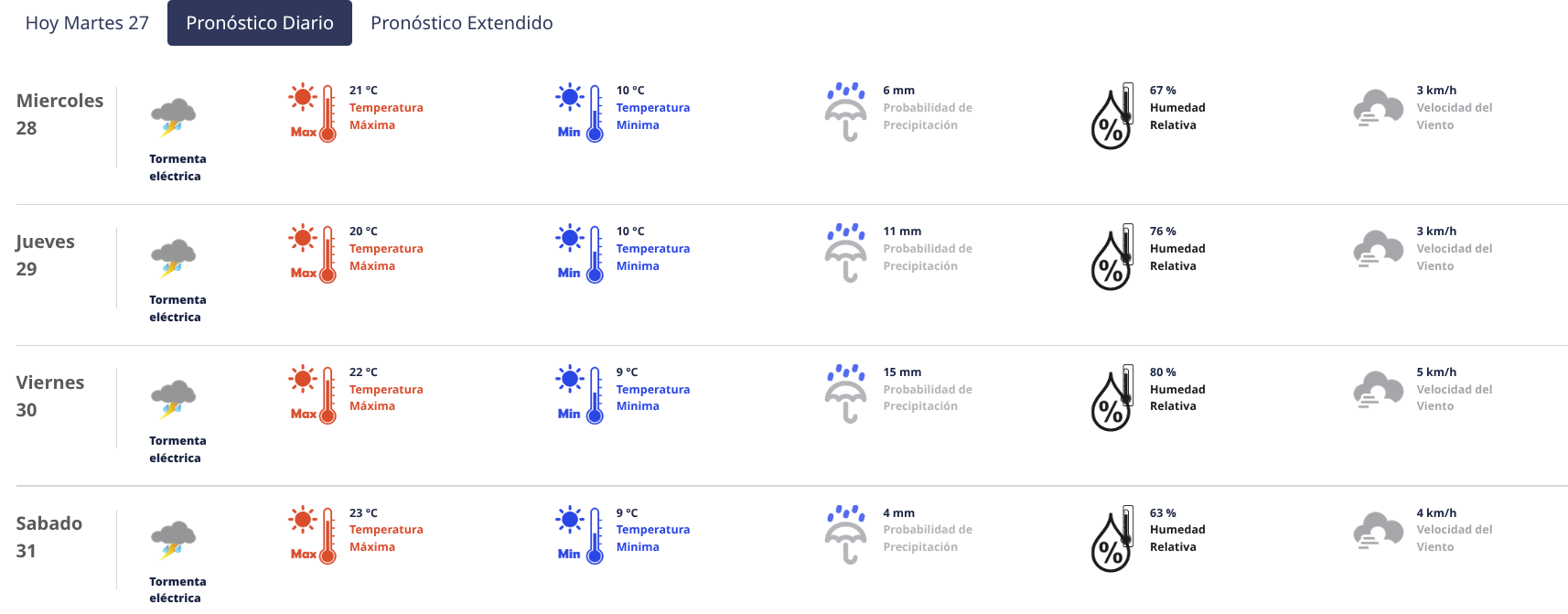 Se esperan «lluvias fuertes, vientos fuertes y descargas eléctricas». El Senami ha reportado una precipitación de 2.4 mm esta madrugada y pronostica cielos nubosos con lluvias y tormentas eléctricas aisladas para los valles, con acumulados de entre 10 y 20 mm para hoy y entre 10 y 40 mm para mañana.
