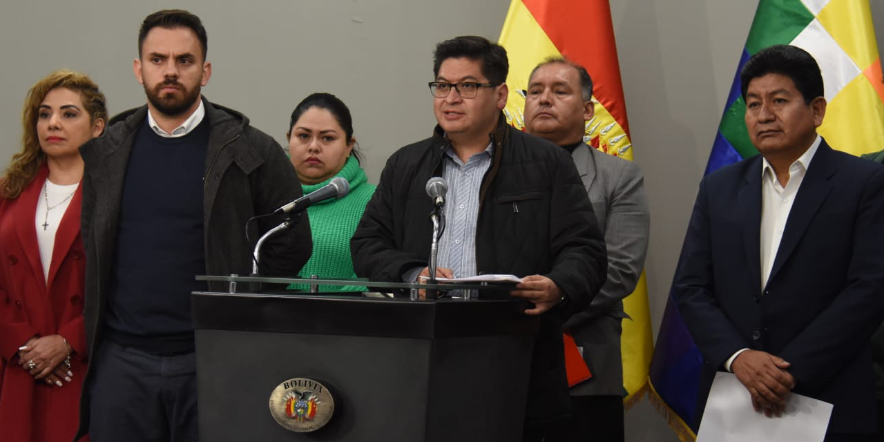 Los ministros de Gobierno, Eduardo del Castillo; de Obras Públicas, Edgar Montaño, y de Economía, Marcelo Montenegro, junto a otras autoridades relacionadas con aeropuertos, ofrecieron una conferencia de prensa desde Casa Grande del Pueblo para informar del avance de las investigaciones y de las decisiones asumidas por instrucción del presidente Luis Arce.