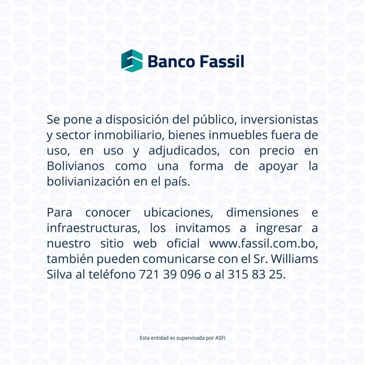 Mediante un comunicado, el Banco Fassil ha puesto en disposición del público, inversionistas y sector inmobiliario sus bienes inmuebles para «apoyar la bolivianización”.